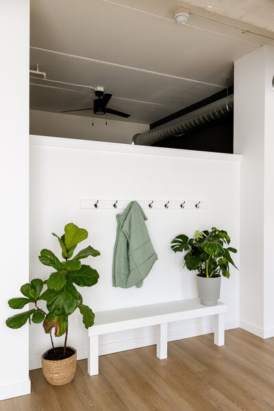 Sheer white curtains hang in front of floor to ceiling windows facing south for beautiful natural light all day long. Coat hooks and a bench are right inside the door for your convenience. There is a private bathroom inside the studio and the studio has it's own private entrance from the street.